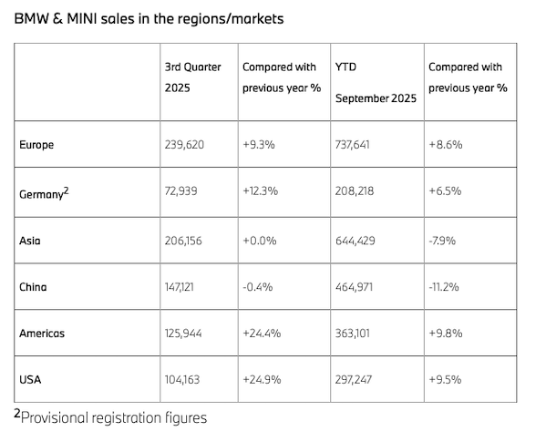 À l'inverse de son éternel concurrent, Mercedes-Benz, BMW a vu ses ventes augmenter de 8,8 %, avec 588 300 unités, durant le troisième trimestre 2025. Cependant, le groupe munichois a annoncé une "légère baisse" de ses objectifs financiers pour l'exercice en cours.