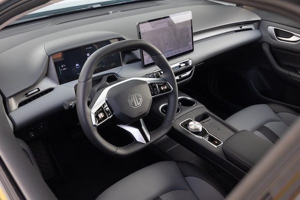 Le grand changement est à l'intérieur où la berline reprend beaucoup au SUV MGS5 EV comme la planche de bord, les sièges ou encore les deux écrans de 7'' pour l'instrumentation et de 12,8'' pour l'infodivertissement.