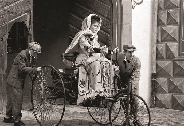 En août 1888, entre Mannheim et Pforzheim, Bertha Benz démontre qu’un voyage en véhicule motorisé est possible à bord du tricycle breveté par son mari Carl Benz. ©Benz