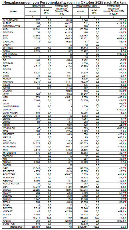 Pour le quatrième mois consécutif, le marché allemand est bien orienté. Ainsi, en octobre 2025, les immatriculations ont progressé de 7,8 %, à 250 133 unités, selon les chiffres de l'Agence fédérale automobile (KBA).