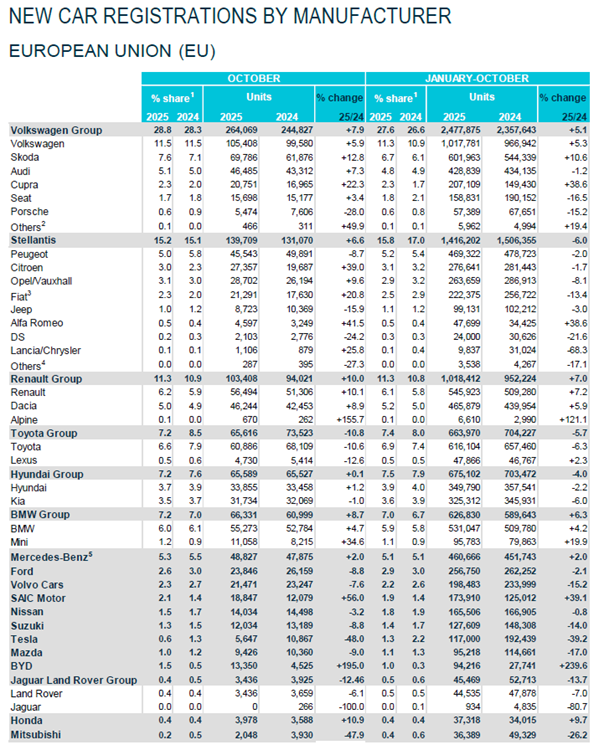 Avec 916 609 immatriculations enregistrées par l'ACEA en octobre 2025, le marché de l'Union affiche une progression de 5,8 %. Il s'agit du quatrième mois consécutif de croissance. Sur les dix premiers mois, le nombre de véhicules neufs vendus atteint 8,974 millions, soit 1,4 % de mieux.