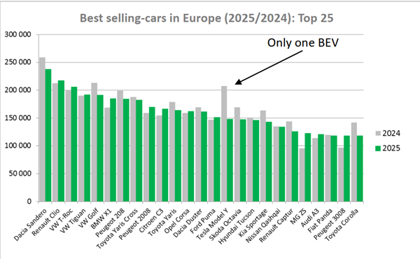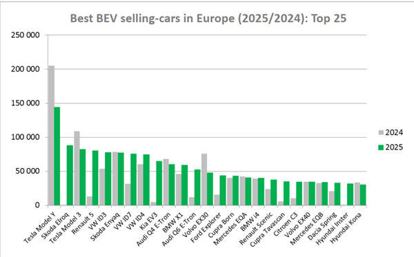 Si l'on fait un focus sur la voiture électrique, Tesla a encore dominé le marché en 2025. Malgré une chute de 30 %, le SUV s'est encore écoulé à 144 097 exemplaires, ce qui lui permet d'être le seul véhicule électrique dans le Top 25 des ventes en Europe.