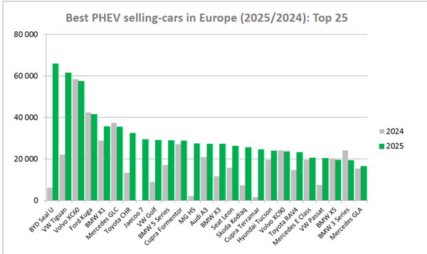 Mais c'est probablement sur le marché de l'hybride rechargeable (PHEV), qui a représenté 1,26 million d'immatriculations (+33,2 %) que le classement est plus surprenant. C'est en effet le BYD Seal U DMi, qui est devenu en 2025, seulement après un an de commercialisation, le plus vendu des modèles hybrides rechargeables en Europe.