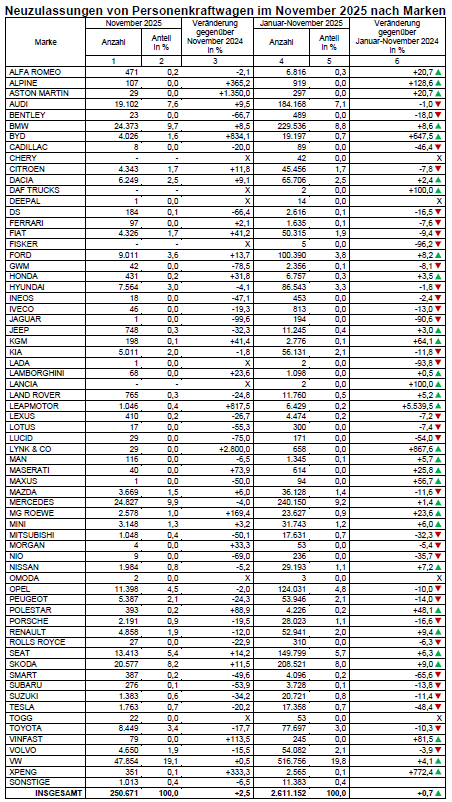 Pour le cinquième mois consécutif, le marché allemand est bien orienté. En novembre 2025, l'Agence fédérale automobile (KBA) a comptabilisé 250 671 immatriculations, en hausse de 2,5 %.