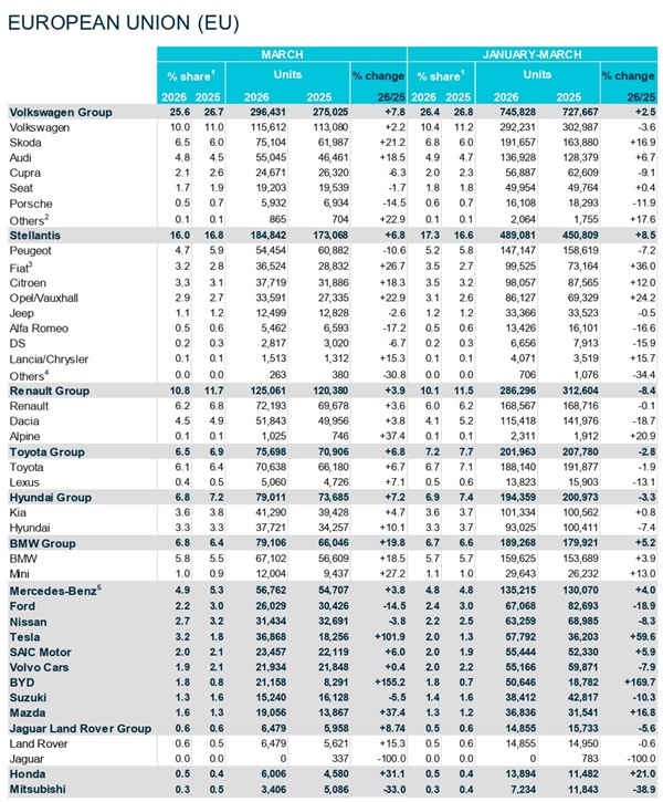 Sur ce mois de mars 2026, Volkswagen domine de loin avec 25,6 % de part de marché et des volumes en hausse de 7,8 %, particulièrement portés par la marque Skoda qui enregistre une croissance de 21,2 %. Stellantis, de son côté, maintient sa deuxième place, représentant une part de marché de 16 % et des immatriculations en hausse de 6,8 %. Une croissance soutenue par les marques Fiat et Opel, dont les immatriculations ont augmenté respectivement de 26,7 % et 22,9 %.