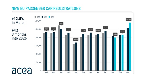 Le mois de mars 2026 se place sous le signe du dynamisme en Europe. En effet, les immatriculations ont bondi de 12,5 % par rapport au mois de mars 2025, selon les chiffres de l’Association des constructeurs automobiles européens (ACEA). Il s’agit là de la plus forte progression mensuelle depuis deux ans. Ainsi, il s’est écoulé au mois de mars 2026 près de 1,16 million de véhicules neufs. Une belle avancée qui permet d’afficher une tendance positive au niveau des immatriculations pour le premier trimestre 2026, en croissance de 4 %.