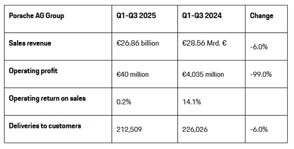 En juillet, Porsche avait déclaré avoir réalisé un bénéfice d'exploitation d'un milliard d'euros au premier semestre, ce qui signifie qu'elle a perdu environ 960 millions d'euros au cours des mois suivants. Les coûts liés aux droits de douane américains ont également eu un impact de 500 millions d'euros.