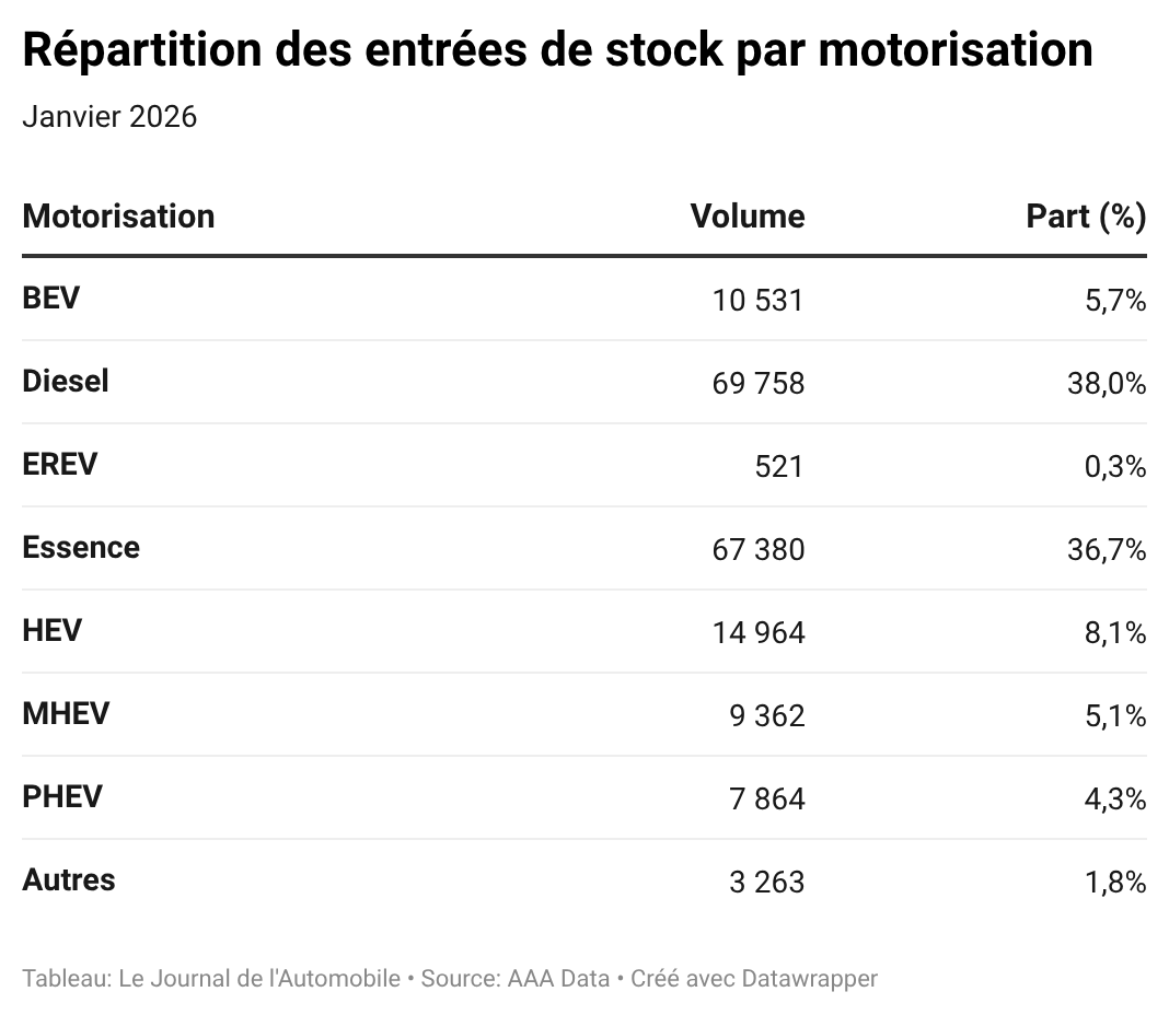 Cette dynamique se reflète dans l’évolution du stock. Fin janvier, les distributeurs détenaient 1 170 445 véhicules d'occasion en parc, contre 1 158 282 un mois plus tôt. La réserve progresse donc légèrement (+1 %), conséquence logique d’un déséquilibre entre le nombre d'entrées et de sorties de stock au cours de la période.