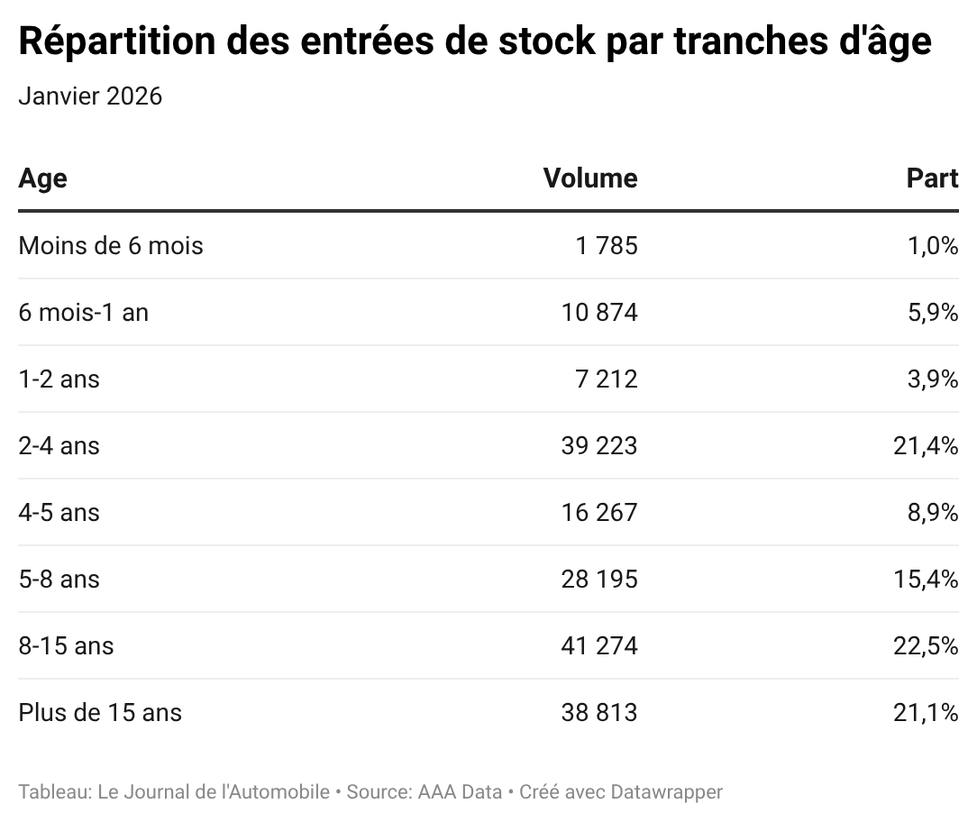 Ce repli s’accompagne d’un vieillissement confirmé du parc entrant. Les véhicules de moins de deux ans, déjà rares en décembre (à peine 11,4 % des entrées), sont redescendus à 10,8 % de pénétration en janvier (sous les 19 900 unités). Le cœur de l'offre a tenu ses positions. Le 2-4 ans a conservé une part de 21,4 % et le segment des 8-15 ans est resté à 22,5 %.