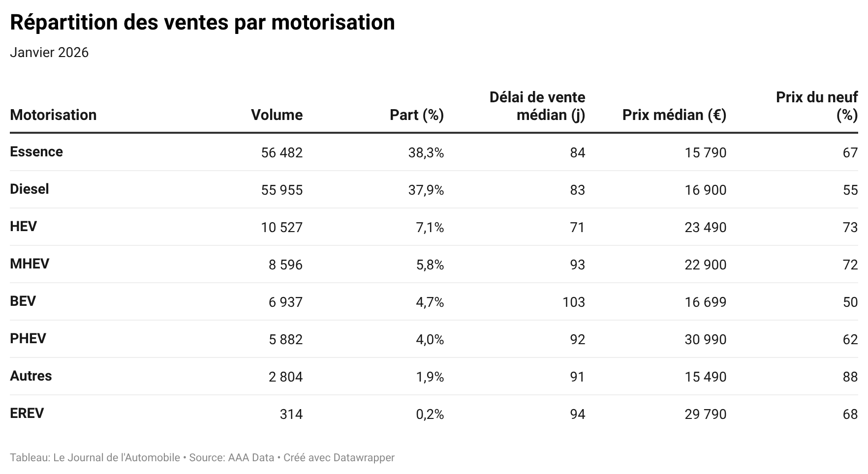 Les contrastes entre motorisations se renforcent : les reventes de modèles électriques chutent de 25 % entre décembre et janvier, à 6 937 unités. Leur délai médian reste le plus élevé du marché (103 jours), alors que leur prix médian se situe sous la moyenne (16 699 euros).