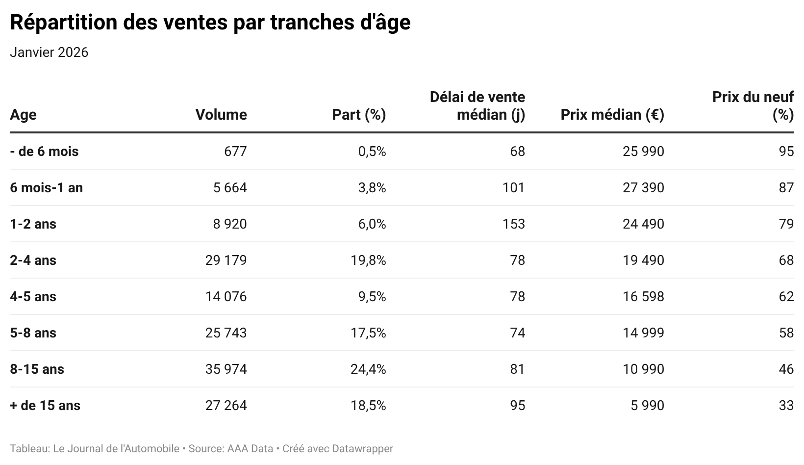 Le marché montre également un décrochage sur les jeunes occasions. Les véhicules de 1 à 2 ans se vendent toujours très difficilement, avec un délai médian qui reste supérieur à 150 jours, même s’il diminue légèrement par rapport aux 173 jours observés en décembre. En revanche, les segments plus anciens absorbent la demande. Les véhicules de 8 à 15 ans se stabilisent à 81 jours de délai médian, au prix de 10 990 euros (46 % de valeur résiduelle). Tandis que ceux de plus de quinze ans s’écoulent en 95 jours, au prix médian de 5 990 euros, soit 33 % de valeur résiduelle. Ce qui vient confirmer – s'il était encore nécessaire – l’appétit persistant du public pour les modèles accessibles.
