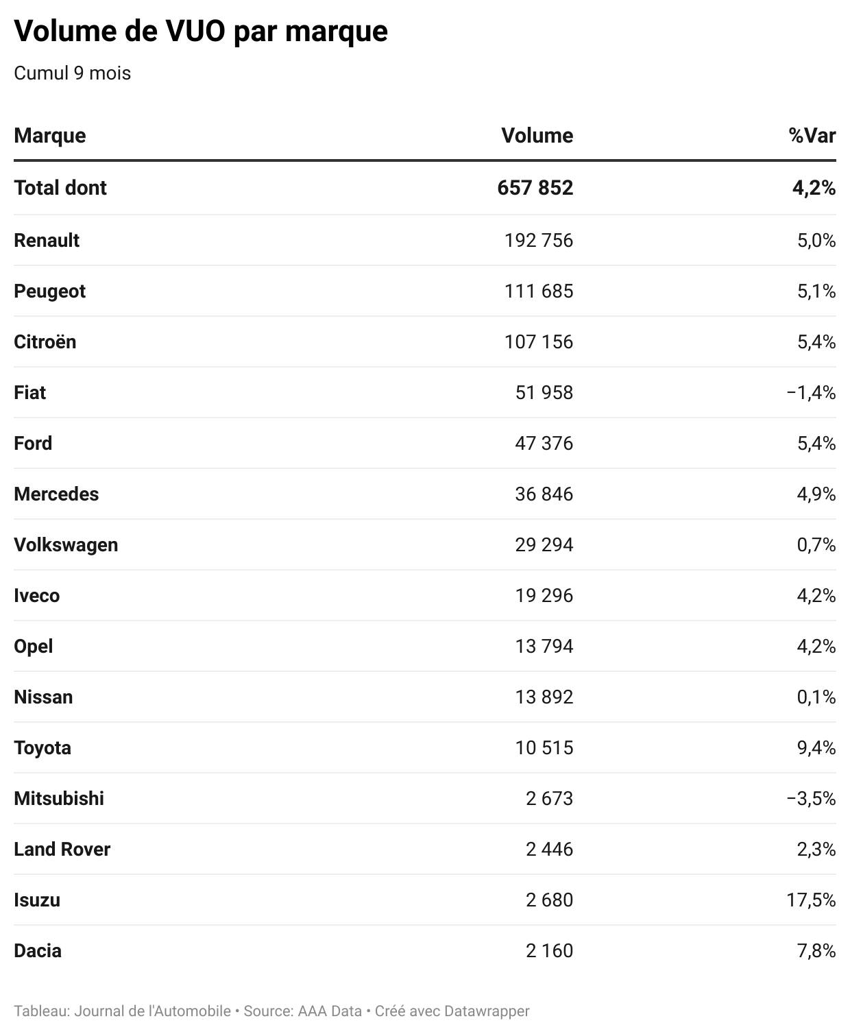 Au cours des douze derniers mois glissants, le marché des véhicules utilitaires d'occasion a empilé 851 229 transactions, toujours d'après AAA Data. Ce cumul a augmenté de 2,9 % par rapport au cycle précédent. L'évolution est de +3,9 % pour Renault (à 256 900 unités) et de 4 % pour Peugeot (à près de 148 500 unités) et pour Citroën (142 430 unités).