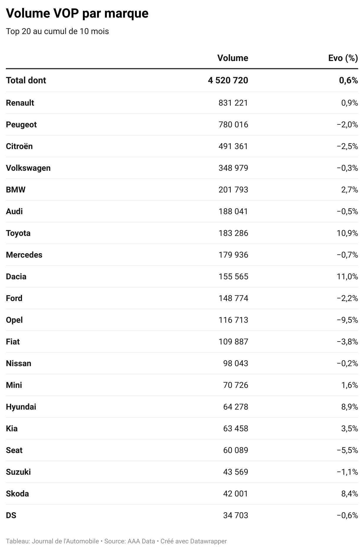 Rares sont les marques de référence à avoir échappé à la morosité du mois tout juste achevé. Parmi les exemples notables peuvent être cités Renault (-1,7 %, à 89 000 unités), Peugeot (-1,6 %, à 83 400 unités), Volkswagen (-3,2 %, à 36 750 unités) ou encore Mercedes (-3 %, à 18 360 unités). La tenue d'une opération Journées portes ouvertes au milieu de la période n'aura pas donné l'impulsion suffisante.