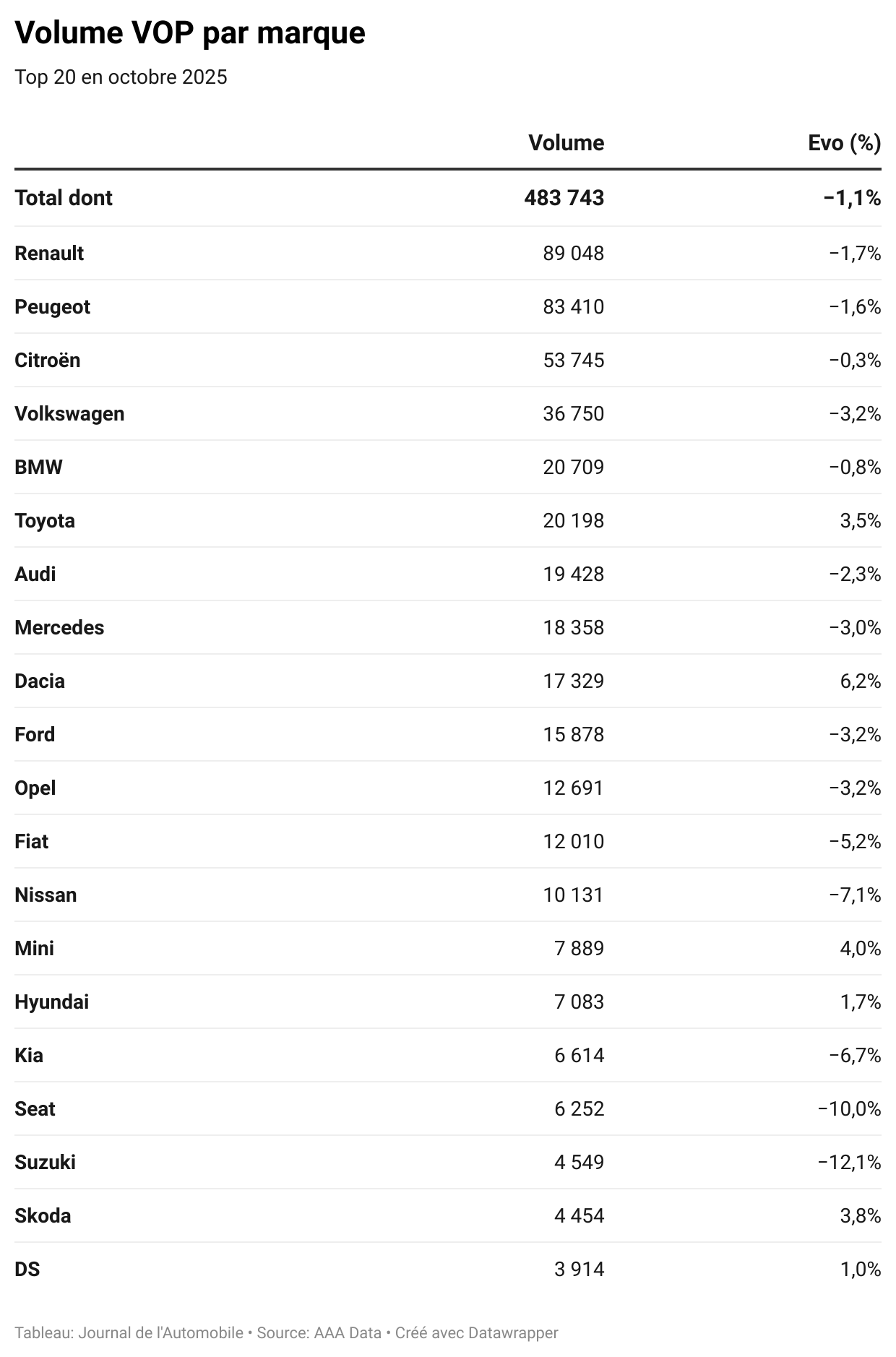 Les reventes de voitures d'occasion n'ont pas été au niveau escompté. En octobre 2025, d'après AAA Data, le volume s'est limité à 483 743 transactions, soit une contraction de 1,1 % par rapport à l'an passé. Il s'agit d'un véritable contrecoup pour le marché qui, en septembre dernier, avait enregistré une croissance de 5,3 %.