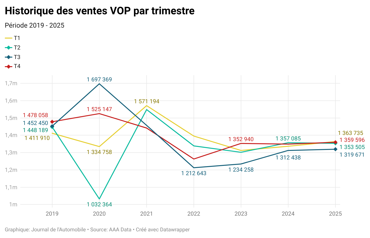 Pendant longtemps, le marché français des voitures d’occasion a obéi à des logiques bien identifiées. Les professionnels de la filière ont toujours parlé d'une saisonnalité relativement marquée. Alors, les trimestres pouvaient se compenser entre eux et, surtout, permettre par un effet de rattrapage d’absorber les aléas conjoncturels. L’analyse des volumes trimestriels, rapportés par AAA Data, entre 2019 et 2025 montre que cet équilibre appartient désormais au passé.
