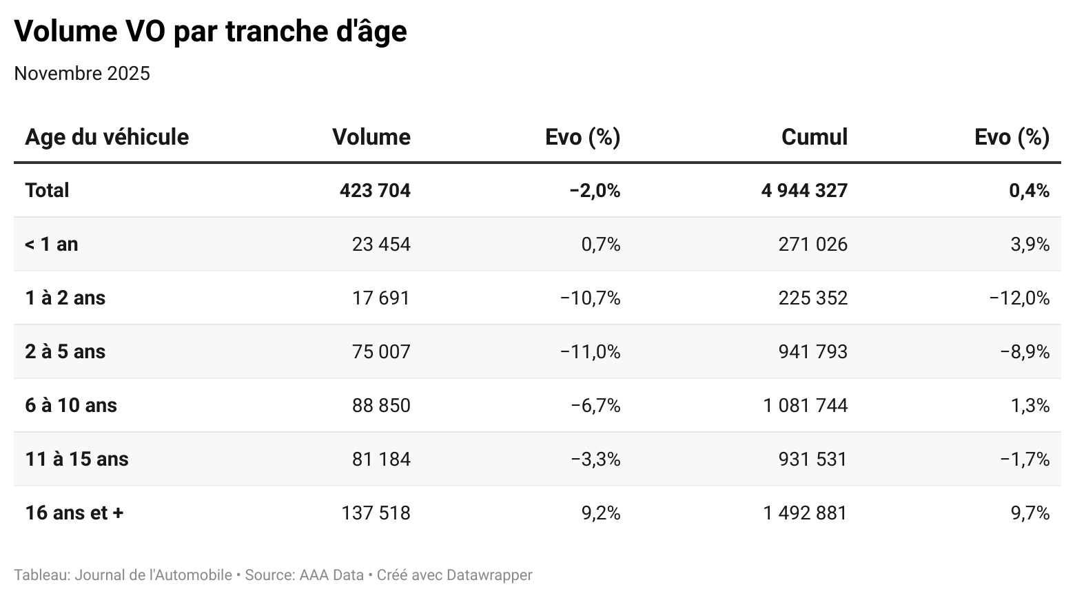 Le bilan édité par AAA Data montre également que le mois de novembre n'a pas souri au cœur de marché. Les deux segments en croissance sont ceux des voitures d'occasion de moins de douze mois (+0,7 %, à 23 450 unités) et des voitures âgées de plus de 16 ans (+9,2 %, à 137 520 unités).