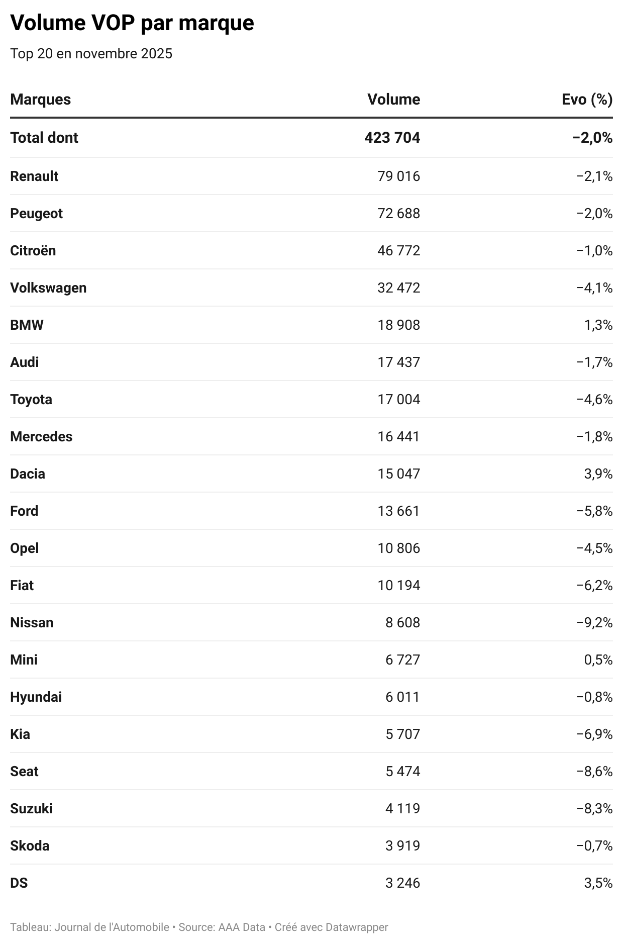 Dans le top 20 des marques privilégiées par les Français, seules cinq ont terminé en croissance par rapport à l'an passé. AAA Data rapporte +1,3 % pour BMW (à 18 900 transactions), +3,9 % pour Dacia (15 050 transactions), +0,5 % pour Mini (6 730 transactions) et +3,5 % pour DS Automobiles (3 250 transactions).
