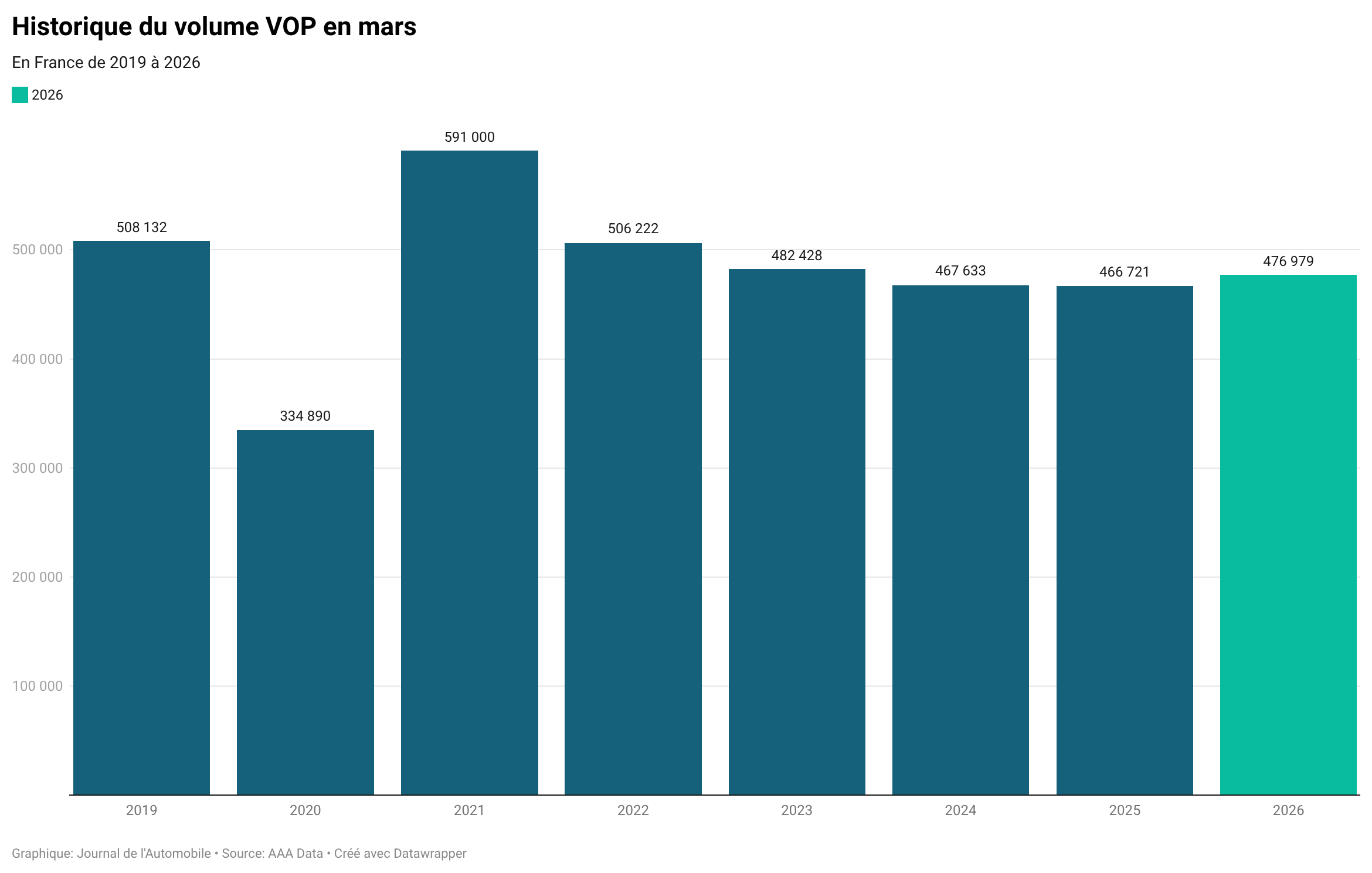 Dans un climat pesant pour le commerce automobile, le marché français des voitures d'occasion achève son premier trimestre avec une once d'espoir. Selon les statistiques de AAA Data, le volume de reventes a augmenté de 2,2 % en mars 2026 pour frôler les 477 000 transactions.