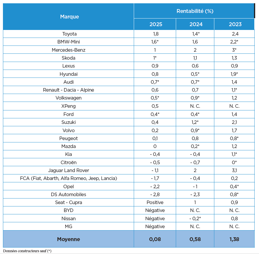 Dans ce contexte dégradé, presque toutes les marques voient leur rentabilité reculer par rapport à 2024. Rares sont celles qui parviennent à tirer leur épingle du jeu. Toyota signe la meilleure performance du marché avec une rentabilité de 1,8 %.