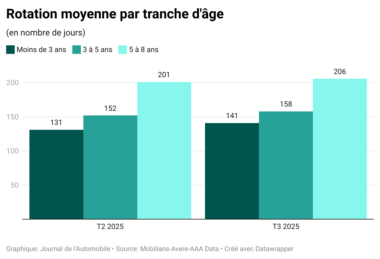 Ce qui importe, c'est la rotation. Cet indicateur s'est dégradé au troisième trimestre. En se fondant sur la première déclaration d'achat par un garage et l'édition du certificat d'immatriculation pour un client final, AAA Data calcule qu'il faut en moyenne 160 jours pour écouler une électrique d'occasion tous âges confondus (139 jours pour une thermique). Au T2 2025, cette durée avait été abaissée à 151 jours. Mais elle grimpait encore à 166 jours au T3 2024.