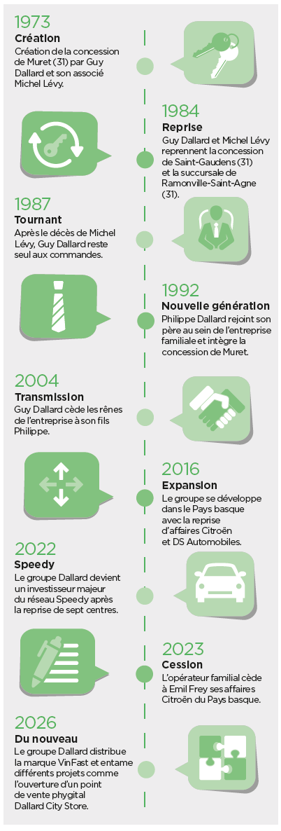 Avant d’être un groupe touche-à-tout, c’est avant tout Citroën qui permet au distributeur occitan de voir le jour. L’histoire commence en 1973. À cette époque, Guy Dallard quitte son poste de vendeur de camions auprès du distributeur de véhicules industriels Saviem pour fonder, avec son ami Michel Lévy, une concession Citroën, qui deviendra le quartier général du groupe jusqu’à aujourd’hui.