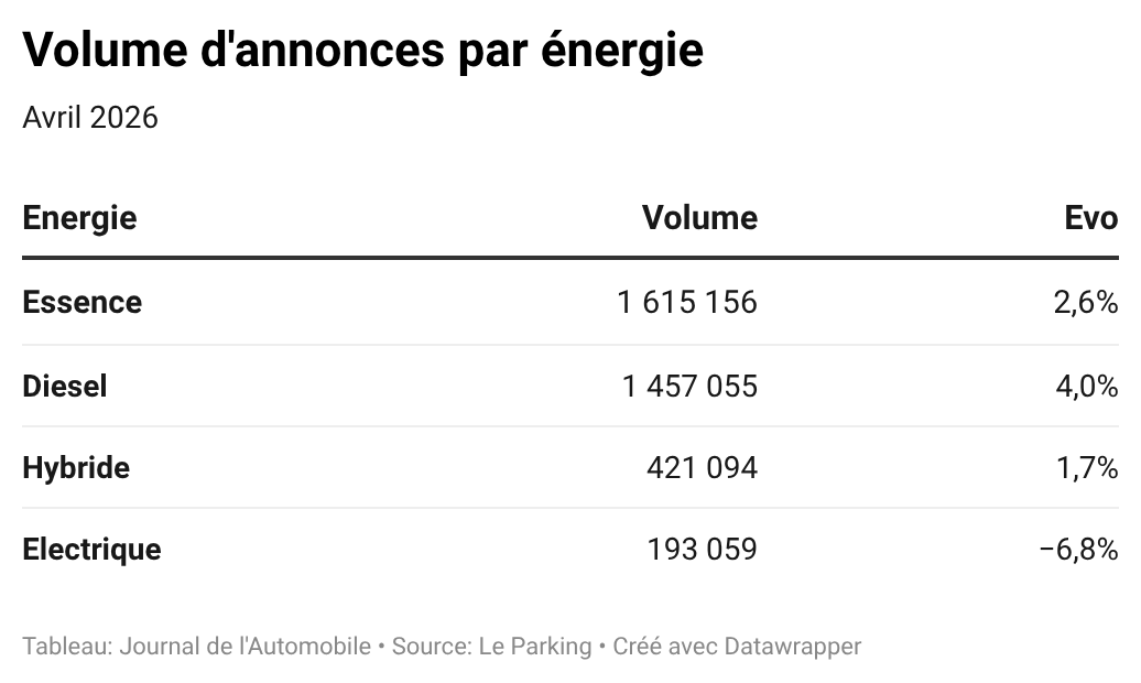 Un regain d'annonces qui concerne toutes les énergies hormis les voitures électriques. Prisées par les consommateurs depuis le début du conflit au Moyen-Orient, cette typologie de produits a réduit de 6,8 %, 193 000 annonces. La France (-7 %, à 51 700 unités), l'Allemagne (-10,5 %, à moins de 91 500 unités) reflètent parfaitement cette tendance.