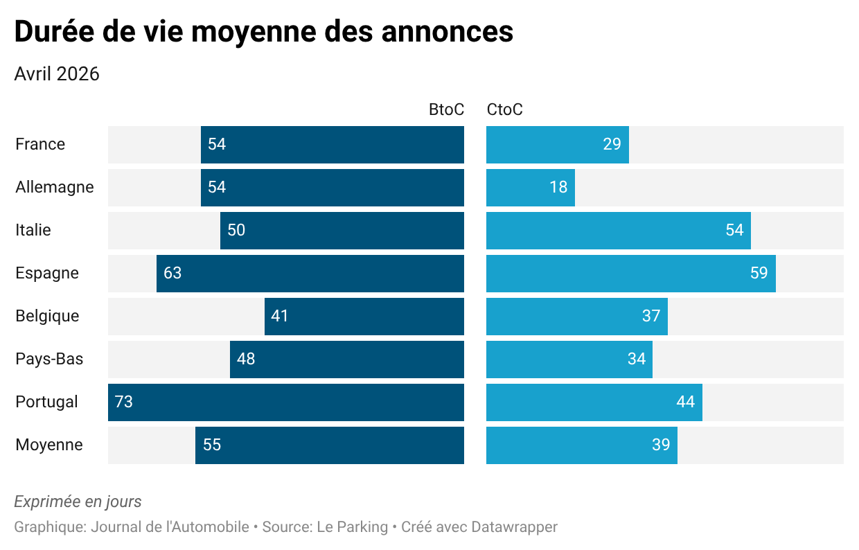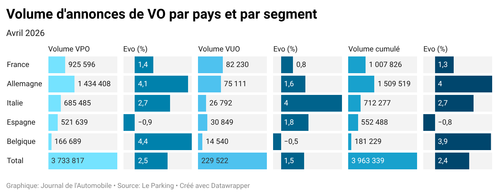 Jamais depuis juillet 2025 il n'y avait eu autant d'annonces visibles simultanément sur les sites des infomédiaires en Europe. Selon les données publiées par Leparking pour son étude mensuelle du marché des véhicules d'occasion, quelque 3,963 millions d'offres garnissaient les plateformes de diffusion françaises, allemandes, italiennes, espagnoles et belges, à la mi-avril 2025.