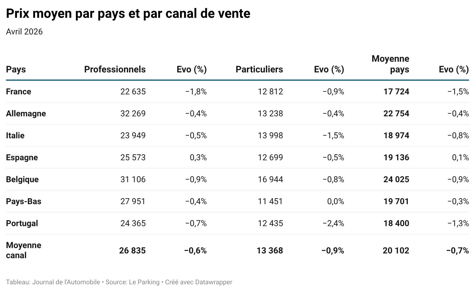 Leparking donne une visibilité à plus grande échelle, en ajoutant les Pays-Bas et le Portugal au panel. En considérant ainsi les sept pays, le prix moyen descend de 0,7 % pour s'établir à 20 102 euros (-0,7 %). Depuis que le baromètre s'est ouvert à ce périmètre géographique, en juillet 2024, le prix moyen n'avait pas plongé si bas.