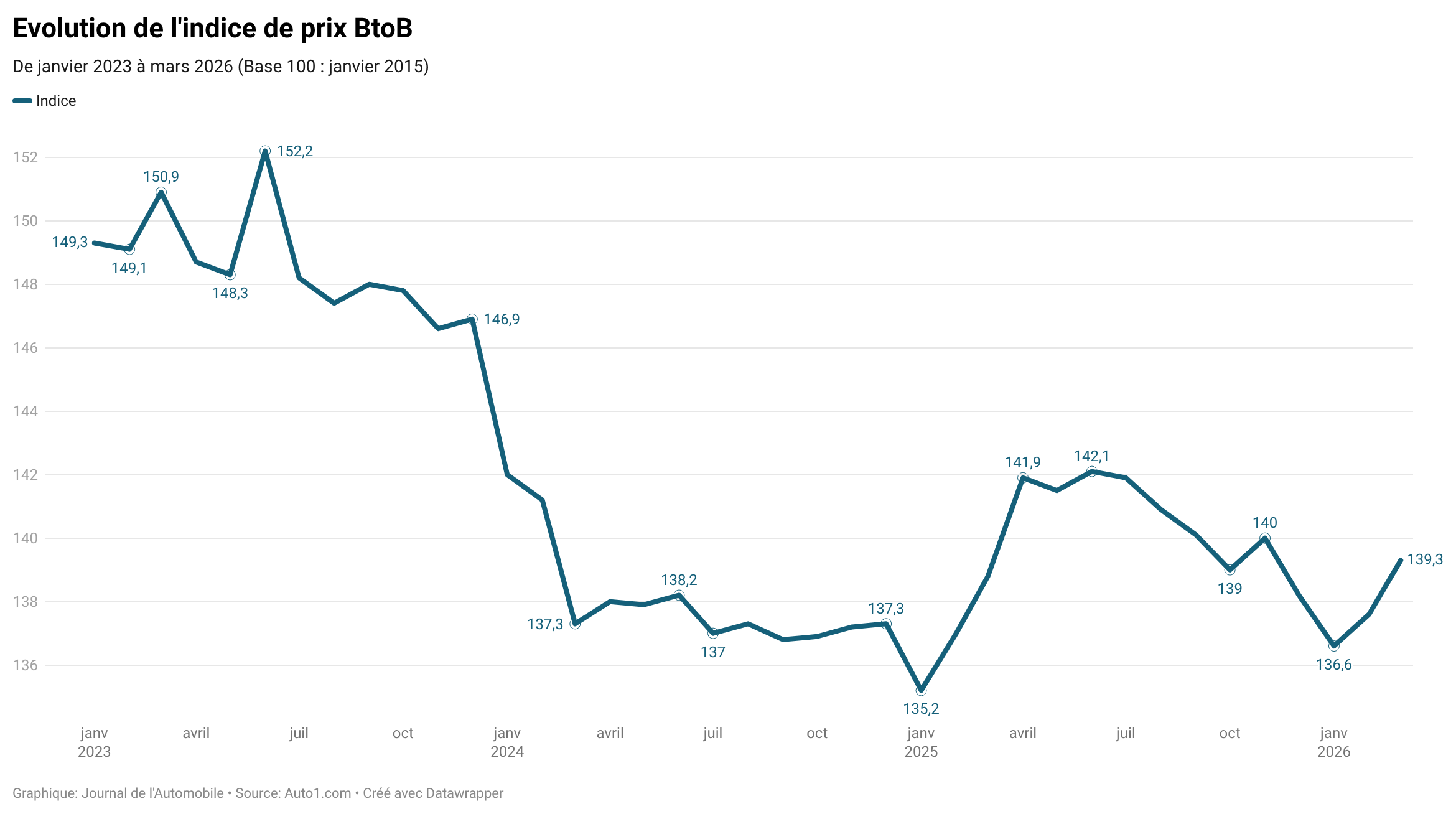 Le temps des grandes variations est révolu, à en croire Auto1 Group qui étudie chaque mois l'indice de prix des transactions des voitures d'occasion entre les professionnels. En mars 2026, le niveau a atteint 139,3, en comparaison avec l'indice de 100 établi en janvier 2015.