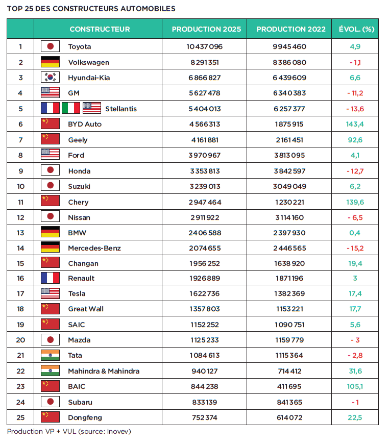 Si le top 5 des constructeurs n’évolue pas depuis quelques années avec, par ordre de volume, les groupes Toyota (10,4 millions ; +4,9 %)*, Volkswagen (8,2 millions ; -1,1 %), Hyundai-Kia (6,8 millions ; +6,6 %), GM (5,6 millions ; -11,2 %) et Stellantis (5,4 millions ; -13,6 %), il s’avère néanmoins très menacé par les constructeurs chinois.