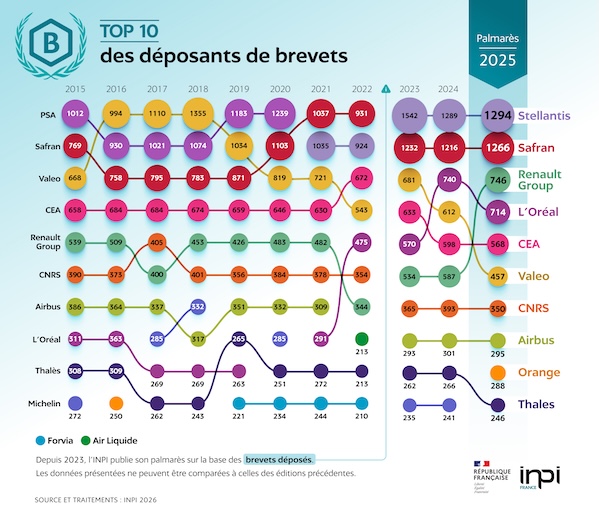 Ainsi, pour la troisième année consécutive, Stellantis est le leader, toutes catégories confondues, avec 1 294 brevets. Le groupe Renault, troisième, y ajoute 746 dépôts alors que Valeo en totalise 457, à la 6e place du top 10.
