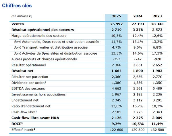 Voilà l'année 2025 résumée en une phrase par le président de Michelin. Le manufacturier avait d'ailleurs révisé à la baisse ses résultats annuels en octobre 2025. Dans ce contexte, le manufacturier français a vu son chiffre d'affaires reculer de 4,4 %, à 26 milliards d'euros. Son bénéfice net a reculé de 12 %, à 1,7 milliard d'euros.