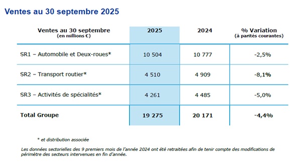 Ainsi, durant le dernier trimestre, les ventes de Michelin ont reculé de 6,6 %, en raison "majoritairement" de la région Amérique du Nord, a indiqué Michelin. Le chiffre d'affaires sur la période a atteint 6,25 milliards d'euros. Sur les neuf premiers mois de l'année, les ventes affichent un repli de 4,4 %, à 19,3 milliards d'euros.