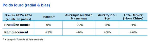 Pour les pneus poids lourd, hors Chine, "les marchés de la première monte reculent de 4 % sous l'effet principal de la chute en Amérique du Nord", qui est de 20 %, "alors que l'Europe se stabilise à un niveau bas", toujours sur neuf mois.