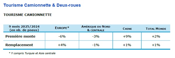 Sur les véhicules de tourisme et les camionnettes, "la demande en première monte augmente de 2 %" sur les neuf premiers mois de l'année, "le rebond du marché chinois masque une baisse sensible en Europe et en Amérique du Nord".