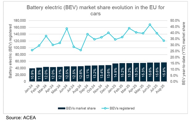Au premier semestre 2025, les voitures électriques ne représentaient que 15,8 % des ventes dans l’UE, alors qu’il en faudrait 25 % pour respecter la trajectoire de 2025. Pour les utilitaires légers, la situation est encore plus critique avec seulement 8,5 % de part de marché.