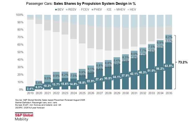 Conséquence : les objectifs 2030 et 2035 sont inatteignables. Selon les projections réalisées par S&P Global Mobility, à peine 63 % des ventes de 2035 seraient électriques à batterie. Un niveau bien loin des 100 % exigés.