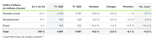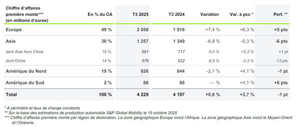 L'entreprise évoque une "surperformance" en Europe au troisième trimestre, avec une hausse de 6,3 % du chiffre d'affaires "première monte", à périmètre et taux de change constants. L'Europe représente la moitié du chiffre d'affaires de l'équipementier (49 %), l'Amérique du Nord 19 %, la Chine 14 % et le reste de l'Asie 16 %.