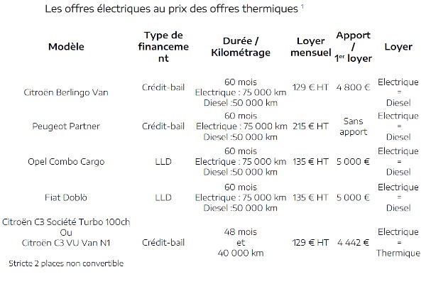 En France, ces offres sont proposées dans le cadre de l’opération commerciale "Jours Pro". Cette dernière s'applique sur toute la gamme de fourgons électriques compacts et de taille moyenne de Stellantis Pro One, comprenant les Citroën Berlingo et Jumpy, les Fiat Professional Doblò et Scudo, les Opel Combo et Vivaro, ainsi que les Peugeot Partner et Expert. La Citroën ë-C3 VU électrique est elle aussi proposée au loyer de la version thermique.