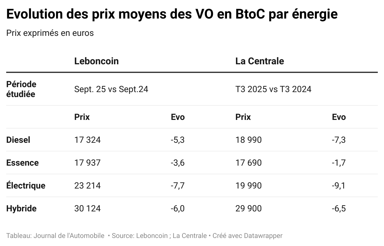 Une déflation des prix qui n'épargne aucune énergie. Entre les troisièmes trimestres 2024 et 2025, La Centrale a constaté des corrections allant de -1,7 % sur les voitures d'occasion essence (17 690 euros) à -9,1 % sur les voitures électriques (19 990 euros). Sans obtenir exactement les mêmes valeurs, Leboncoin dépeint une situation similaire quant à l'évolution des prix.